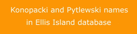 This database includes 55 persons with surname similar to Konopacki(a). Jadwiga Konopacka née Swinarska, and son Waclaw, appear at positions 5 and 11. Jadwiga sailed from Bremen to New York on the ship Kronprinz Wilhelm to be with her husband Kazimierz Konopacki, who lived in Chicago Hills. In addition, 6 names similar to Pytlewski(a) were also found . Clicking on a particular name reveals further information about that person including copies of original documents from the immigration office at Ellis Island.