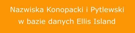 Na początku roku 2001 została udostępniona dokumentacja 22 milionów emigrantów do USA, którzy wylądowali w głównym ośrodku imigracyjnym na Ellis Island pod Nowym Jorkiem od 1892 do 1924 roku.  Niestety, baza danych zawiera masę błędów, wprowadzonych często przez osoby odczytujące dane z dokumentów.  Oczywiście, wielu emigrantów było niepiśmiennych i sami nie bardzo mogli wiedzieć, jak poprawnie powinny być pisane ich imiona, nazwiska i miejsca urodzenia. W tej bazie danych jest 55 osób o nazwisku zbliżonym do Konopacki(a). Na pozycjach 5 i 11 znajdują się Jadwiga Konopacka z domu Swinarska z synkiem Wacławem. Jadwiga przyjechała statkiem Kronprinz Wilhelm z Bremy do Nowego Jorku do swojego męża Kazimierza Konopackiego, który już mieszkał w Chicago Hills. W bazie odnaleziono również 6 osób o nazwisku zbliżonym do Pytlewski(a).  Można kliknąć na każde nazwisko, aby zobaczyć dane tej osoby a także kopie oryginalnych dokumentów z urzędu imigracyjnego w Ellis Island. |